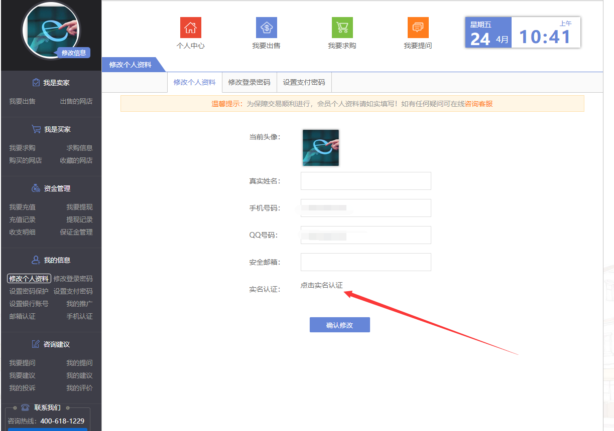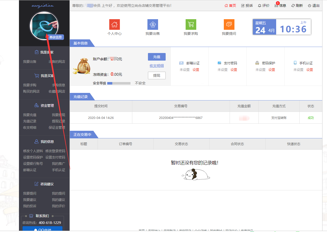 登入立尚合官方平台会员中心,点击修改信息(如图)