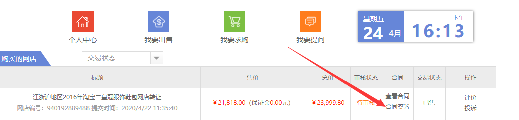 认证完成后返回会员中心点我出售的店铺(或我购买的店铺)然后点签署合同如图