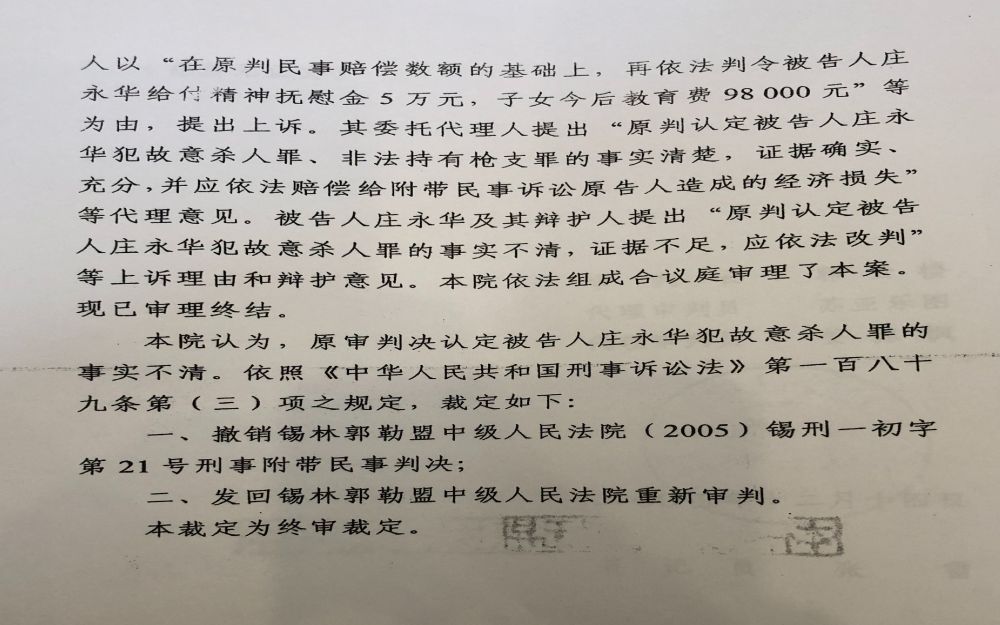 庄永华不服,提出上诉。2005年12月14日,内蒙古自治区高级人民法院以“事实不清”为由,将该案发回锡林郭勒盟中级法院重新审理。
