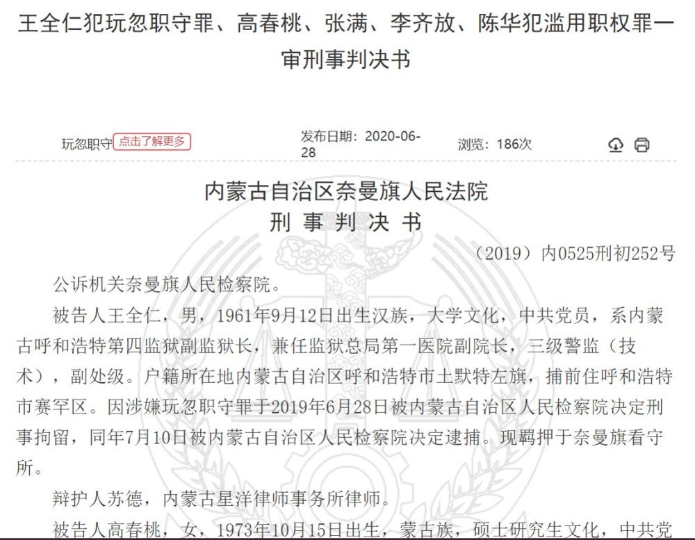 今年4月,五名狱医因犯滥用职权罪获刑。中国裁判文书网截图