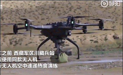 此前曾曝光的西藏军区演练高原地区无人机空中送餐的新闻。