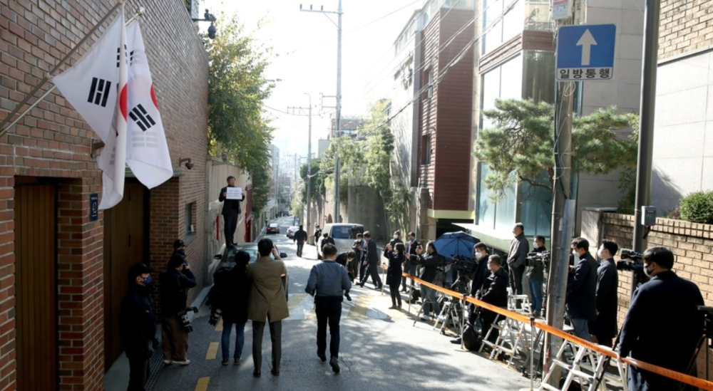29日上午,大批记者聚集在李明博住宅前(韩联社)