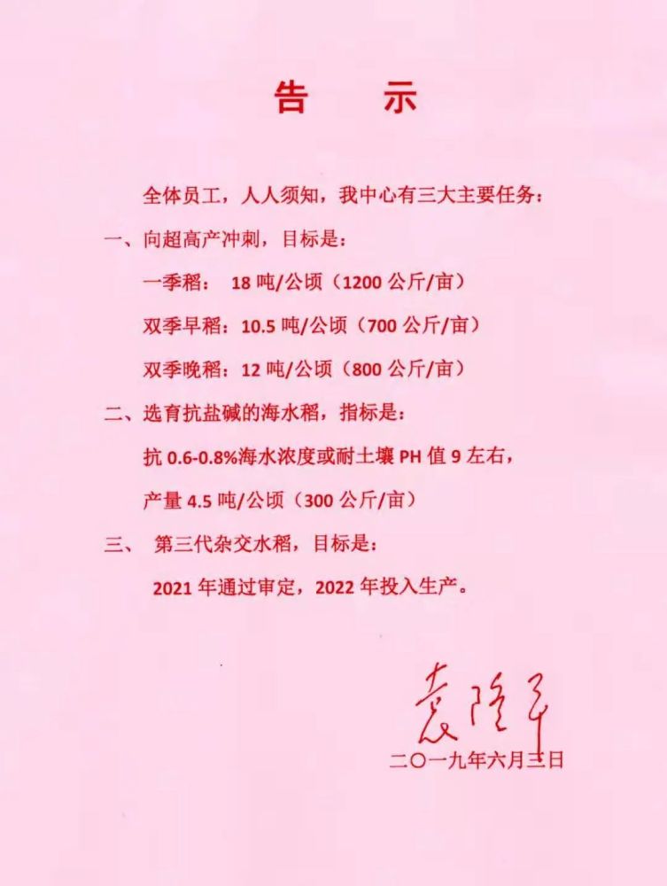 “全体员工,人人须知,我中心有三大主要任务。”2019年6月3日,湖南杂交水稻研究中心挂出了中国工程院院士袁隆平亲笔签名的“告示”,他给团队定下了“三大新目标”:超高产冲刺、耐盐碱水稻及第三代杂交水稻。