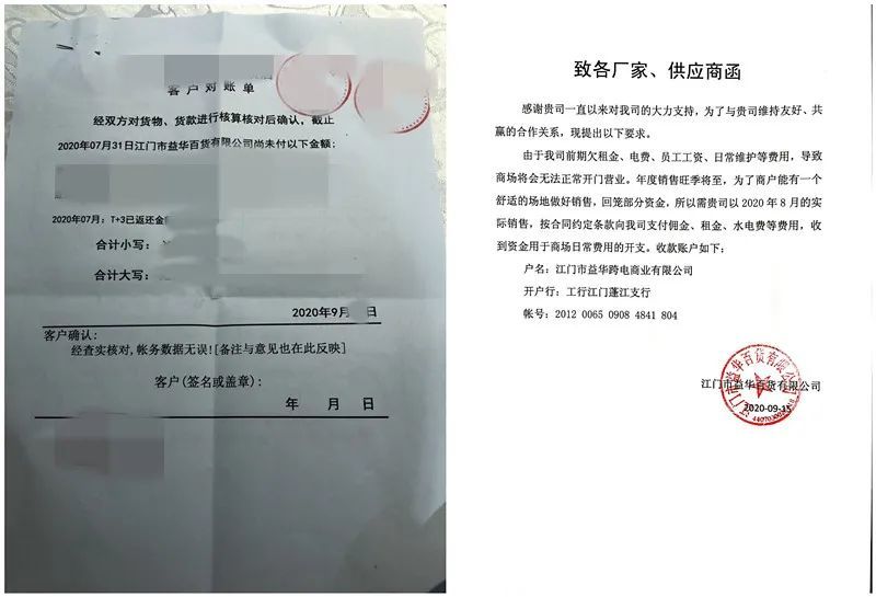 注:左图为商户提供的益华百货欠款单;右图为益华百货催商户交租金的函