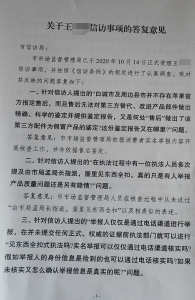 其中,针对信访人提出的“白城市及周边县市并不存在苹果官方指定售后,如何作出第三方配件为假冒产品的鉴定?这份鉴定报告又在哪里”的问题,答复意见称,市场监督管理局依据消费者实名举报内容开展核查工作,并非依据售后鉴定。