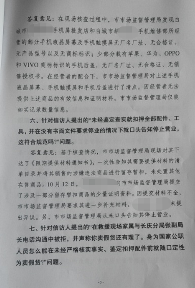 针对信访人提出的“现场及回分局后并未对扣押的配件进行详细清点、标注只是简单记录了数量,这符合流程吗”的问题,答复意见称,在现场核查过程中,市场监督管理局发现白城市七某手机屏批发店和白城市胡某手机维修部所经营的部分手机液晶屏幕及手机触摸屏无厂名厂址、无合格证无产品型号以及无商标标识;少部分载有苹果、华为、OPPO和VIVO商标标识的手机后盖,无厂名厂址、无合格证、无销售投权书。在经营者的配合下,市场监督管理局对上述手机液晶屏幕、手机触摸屏和手机后盖进行了清点。因经营者无法提供上述商品的有效信和证明材料,市场些管理局仅能如实记录数量信息。