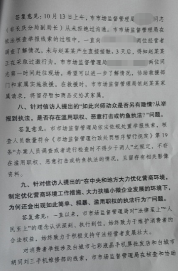 红星新闻从白城市市场监管局10月28日出具的一份关于此事的答复意见看到,白城市市场监管局已于2020年10月14日正式受理赵某某家属信访问题,并按照《信访条例》的规定进行了认真调查。针对家属提出的9个问题,市场监管局分别予以答复。