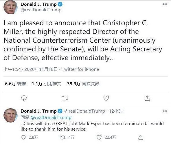 随后,特朗普在推特中兴奋地宣布,美国国家反恐中心主任克里斯托弗·米勒将担任代理国防部长。在紧跟这条状态的留言中,特朗普表示,原国防部长埃斯珀已经被解雇,并顺便对埃斯珀的贡献象征性表示了感谢。
