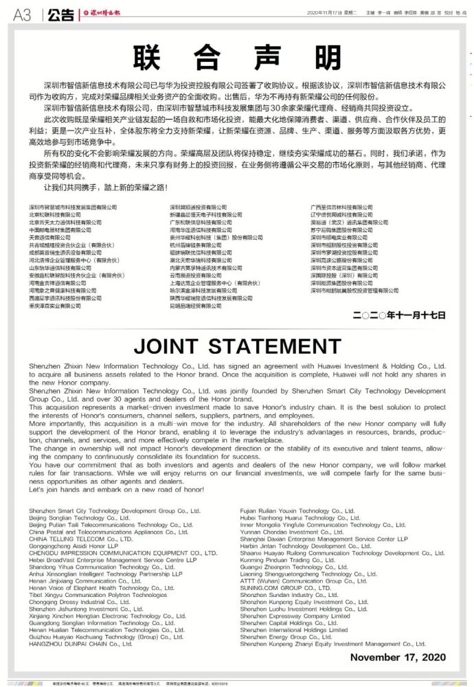 今日(17日),多家企业在《深圳特区报》发布联合声明,深圳市智信新信息技术有限公司已与华为投资控股有限公司签署了收购协议,完成对荣耀品牌相关业务资产的全面收购。出售后,华为不再持有新荣耀公司的任何股份。