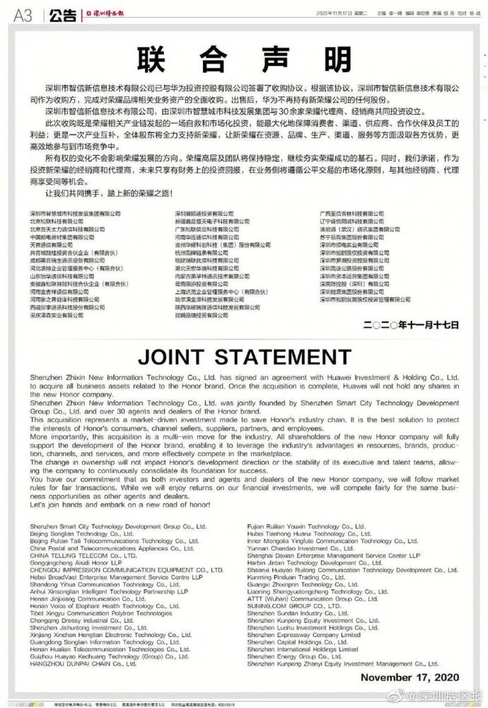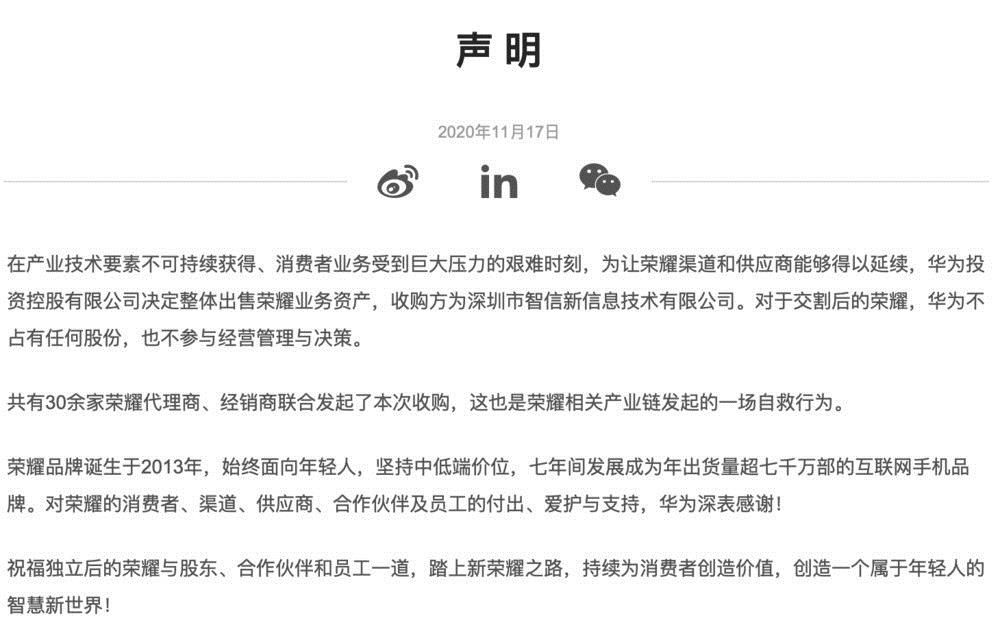 2020 年 11 月 17 日早,多家企业在《深圳特区报》发布联合声明,深圳市智信新信息技术有限公司已与华为投资控股有限公司签署了收购协议,完成对荣耀品牌相关业务资产的全面收购。出售后,华为不再持有新荣耀公司的任何股份。