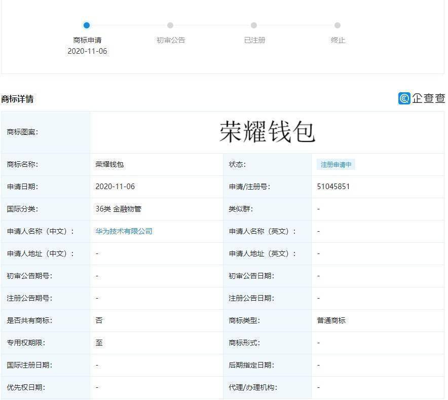 企查查 App 显示,近日,华为技术有限公司新增多条商标信息,包括名为 “荣耀” “荣耀视频”“荣耀钱包”“荣耀阅读”“荣耀亲选”“荣耀花粉”等,申请日期在 11 月 6 日。视频、钱包等都是此前华为的互联网业务,华为、荣耀公用一套体系。独立后的新公司,自然需要完全独立的新业务,“荣耀亲选”是类似小米有品的电商平台,提供自家、合作伙伴的智能硬件、耗材等产品的销售,部分互联网业务,也会随着此次交易剥离。