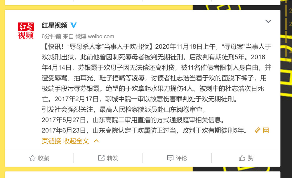 2020年11月18日上午,“辱母案”当事人于欢减刑出狱,此前他曾因刺死辱母者被判无期徒刑,后改判有期徒刑5年。2016年4月14日,苏银霞于欢母子因无法偿还高利贷,被11名催债者限制人身自由,并遭受辱骂、抽耳光、鞋子捂嘴等凌辱,讨债者杜志浩当着于欢的面脱下裤子,用极端手段污辱苏银霞。绝望的于欢拿起水果刀捅伤4人。被刺中的杜志浩次日死亡。2017年2月17日,聊城中院一审以故意伤害罪判处于欢无期徒刑。