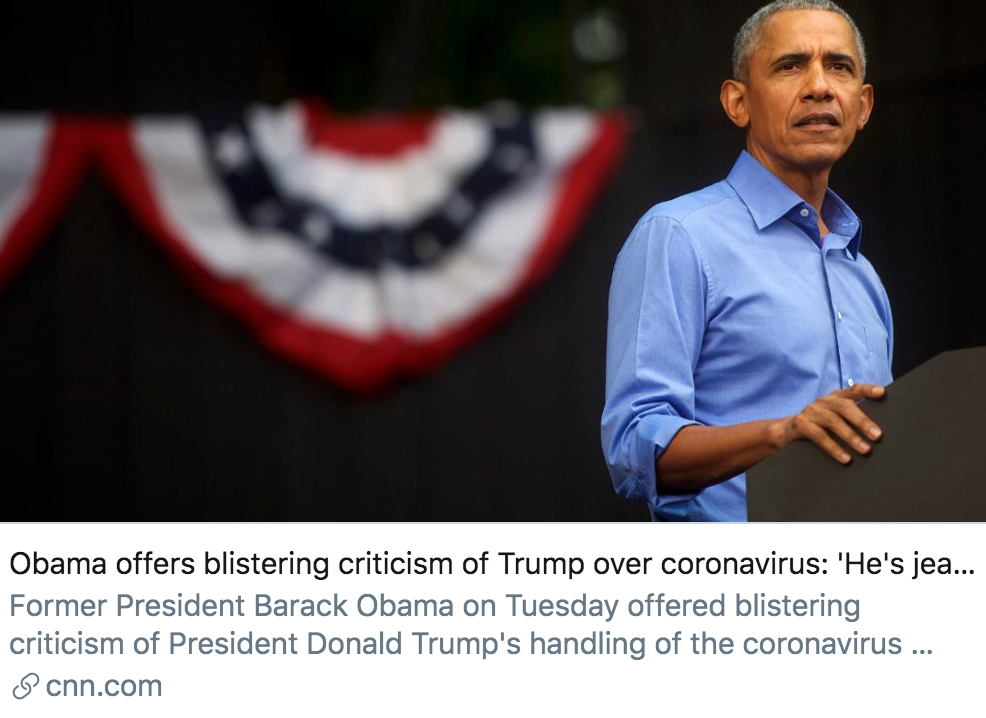 ▲奥巴马就新冠肺炎疫情抨击特朗普,“他嫉妒媒体对新冠的报道”。/CNN报道截图