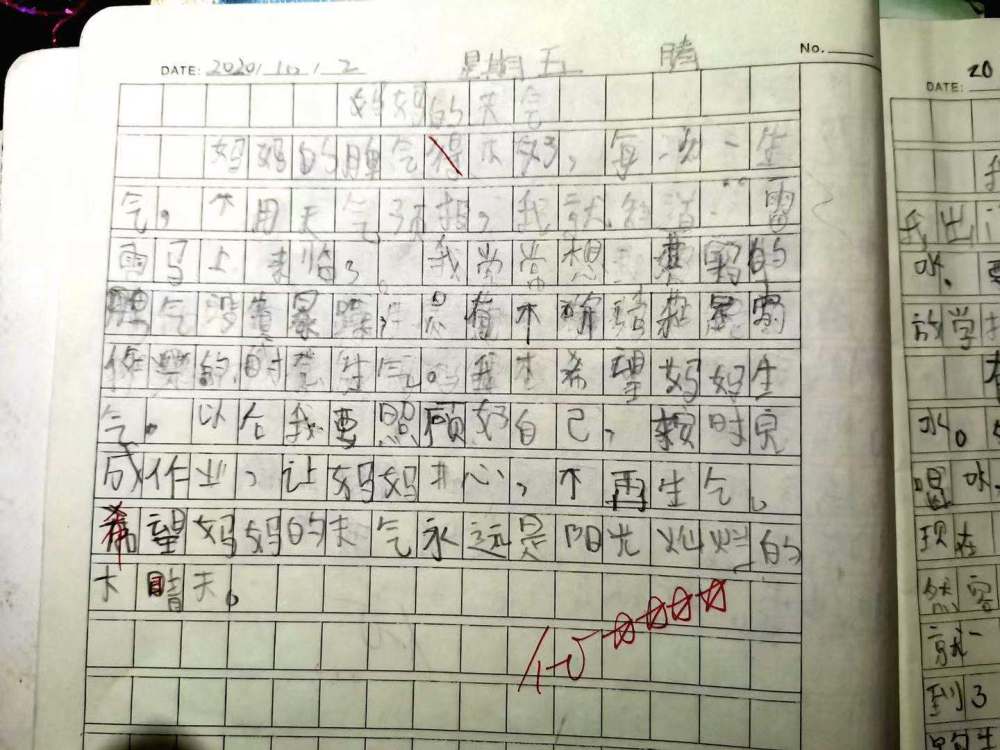 我会给他施加压力,告诉他“写不完的时候不准睡觉”,有的时候我还会拍桌子。刚开始我没有意识到我自己这一面,但最近孩子写了一篇日记,我才发现原来我在孩子眼中有另外一面。