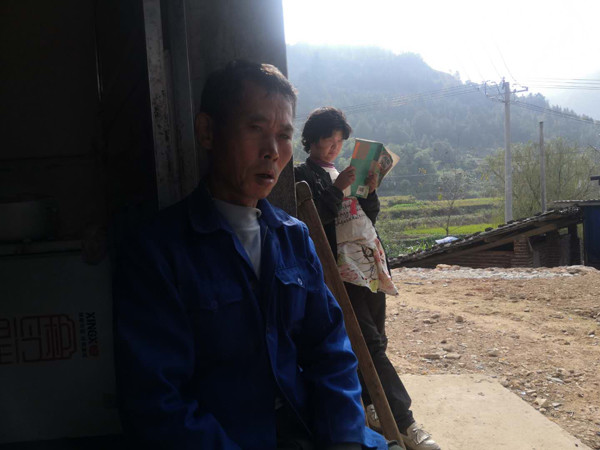 11月3日,范家发坐在家门口回忆往事,妻子张丽拿着一本书在“看”。
