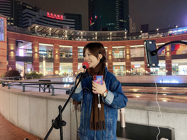 每逢周三,她都会早做准备,提前完成手头的工作,踏出位于银城中路的办公楼后,吃个便饭匆匆赶到东方路,摆出音箱、话筒支架和直播设备,七点半开始唱歌。工作日驻足听歌的人不多,稀稀拉拉地靠着栏杆,偶有情侣停下脚步,逗笑称“她唱得比你好”。也有小朋友跑到她身旁,聚精会神地盯着手机歌词,兴奋时要拉着妈妈转圈。
