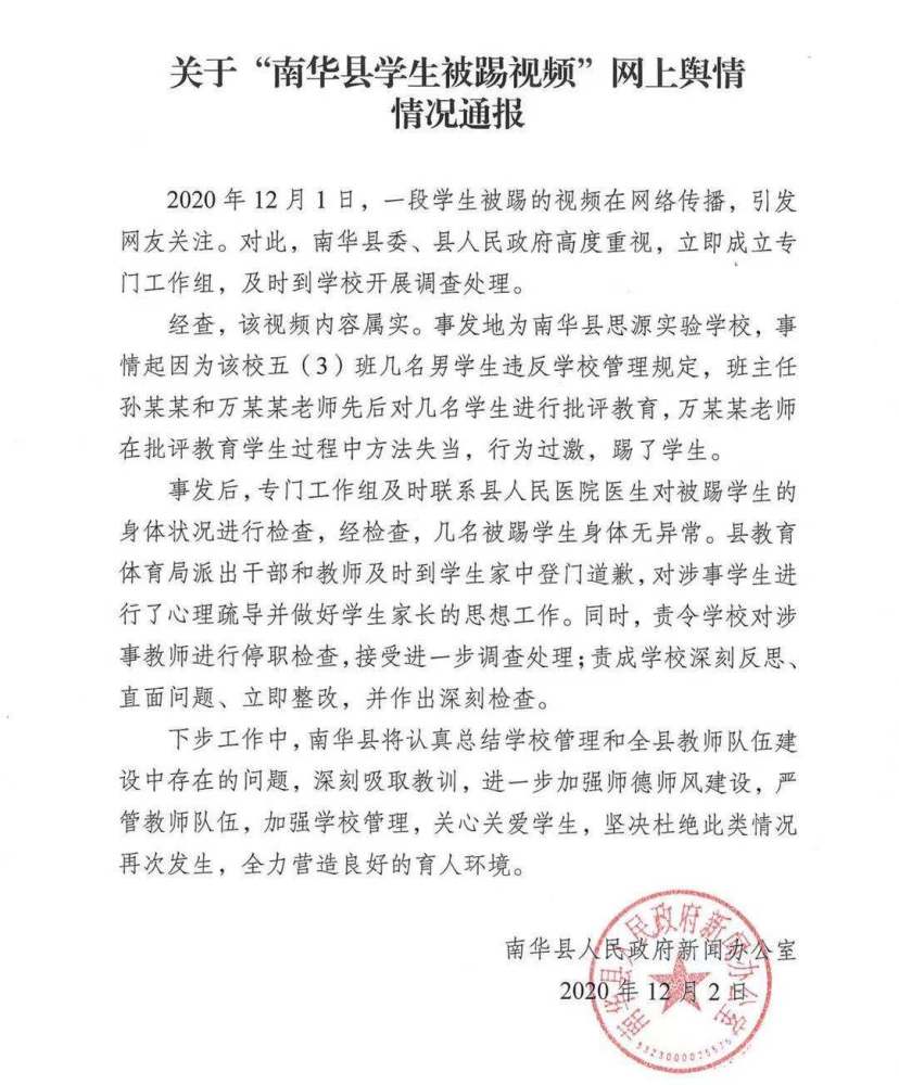 随后,南华县人民政府新闻办公室通报,2020年12月1日,一段学生被踢的视频在网络传播,引发网友关注。对此,南华县委、县人民政府高度重视,立即成立专门工作组,及时到学校开展调查处理。
