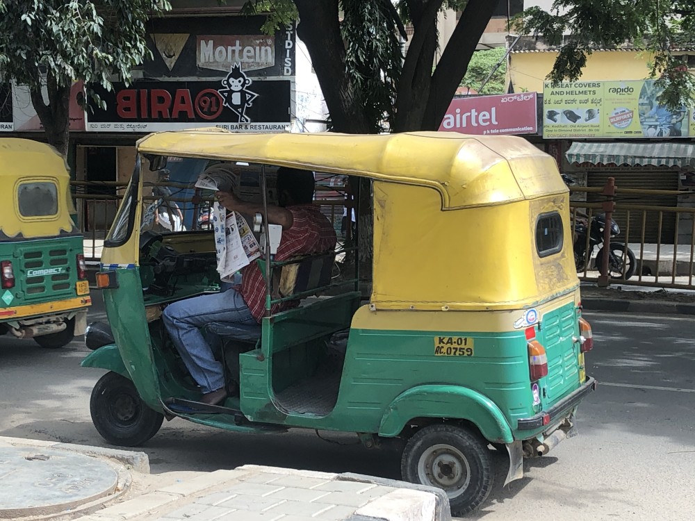 班加罗尔的街道上读报纸的突突车司机
