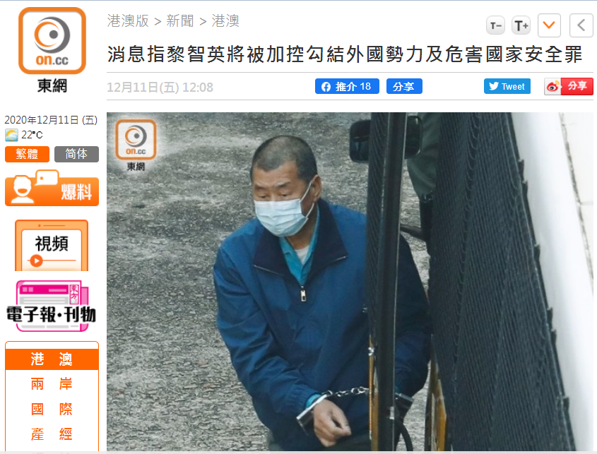 香港“东网”随后也有消息称,目前已被押抵荔枝角收押所的黎智英,被加控“勾结外国势力”和“危害国家安全”罪,将于明日(12日)提审。