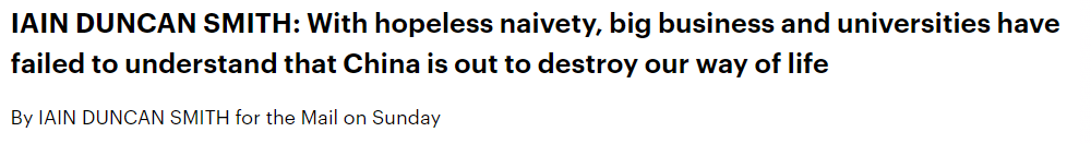 另外英国前保守党领袖伊恩·邓肯·史密斯也是IPAC的负责人。 巧合的是,就在英国《每日邮报》刊登有关这个所谓泄密文件的报道之后,这位史密斯先生立马就在《邮报》上发表观点文章,毫无依据地指责中国“正在摧毁英国的生活方式”。