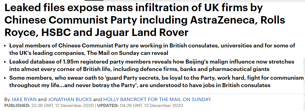 但这些西方媒体和反华政客要么是无知,要么就是揣着明白装糊涂。它们查了一下所谓在华外国企业一共招聘了多少党员,结果“一查吓了一跳”:“竟然”有数百名中共党员不仅在相关跨国公司,甚至还在其中的一些“敏感机构”任职,比如汇丰和渣打银行、制药巨头辉瑞和阿斯利康公司以及空客、波音和劳斯莱斯等具有国防工业利益的公司。