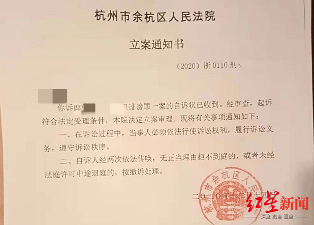 12月11日,诉讼代理人向余杭法院补充提交了刑事自诉状及证据材料。余杭法院于14日立案受理。