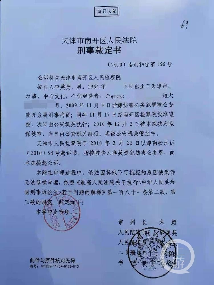 多次延期审理之后,南开区人民法院于2010年12月2日作出刑事裁定,“因其他不可抗拒的原因使案件无法继续审理”,裁定中止审理。李英贵于当日得到取保候审,2011年12月2日,取保候审到期,南开区人民法院解除对李英贵取保候审强制措施,此案再无下文。