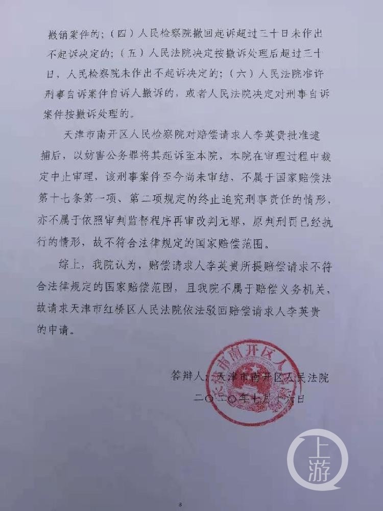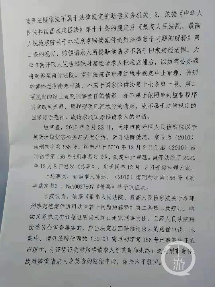 在开庭前一天的12月11日,红桥区法院作出国家赔偿决定书,该决定书显示,有证据证明李英贵尚未终止追究刑事责任,驳回其赔偿申请。也在这一天,李英贵接到法院电话称,开庭取消,等候通知。