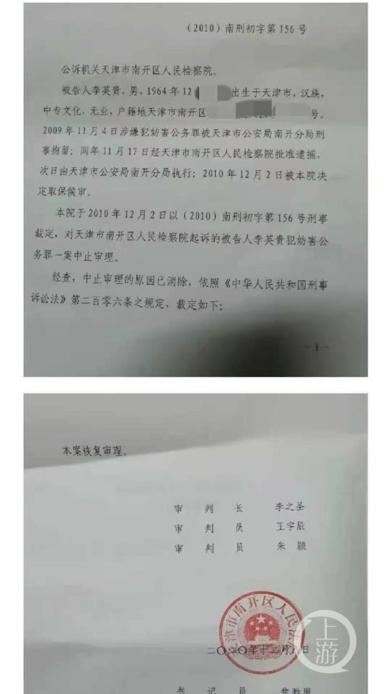12月8日,南开区法院给李英贵送达刑事裁定书,正式决定恢复十年前的妨害公务一案庭审,并通知李英贵案件在12月12日开庭审理。