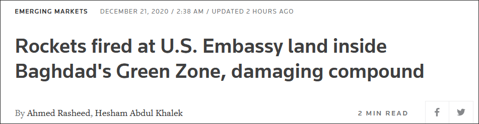 今年年初,在伊朗伊斯兰革命卫队高级将领苏莱曼尼被美国刺杀后,1月4日及5日巴格达“绿区”连续两天遭到火箭弹袭击,其中多枚火箭弹在美国大使馆附近爆炸,但未命中。此后数月,“绿区”屡次遭到火箭弹袭击,并造成了人员伤亡。