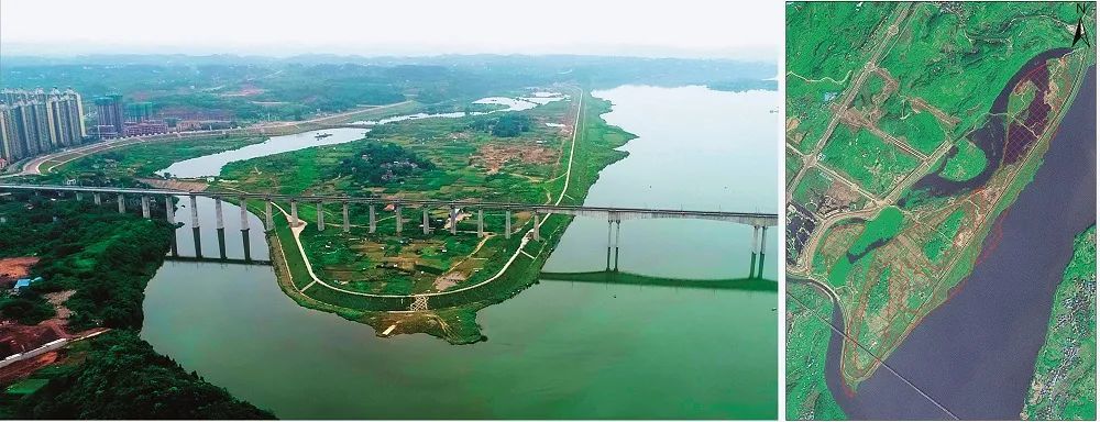 (2019年4月,南充市桑树坝河滩地确权位置示意图(右) 及实景图。桑树坝有一千多亩集体土地被确权为国有河滩地。图/南充市自然资源和规划局)