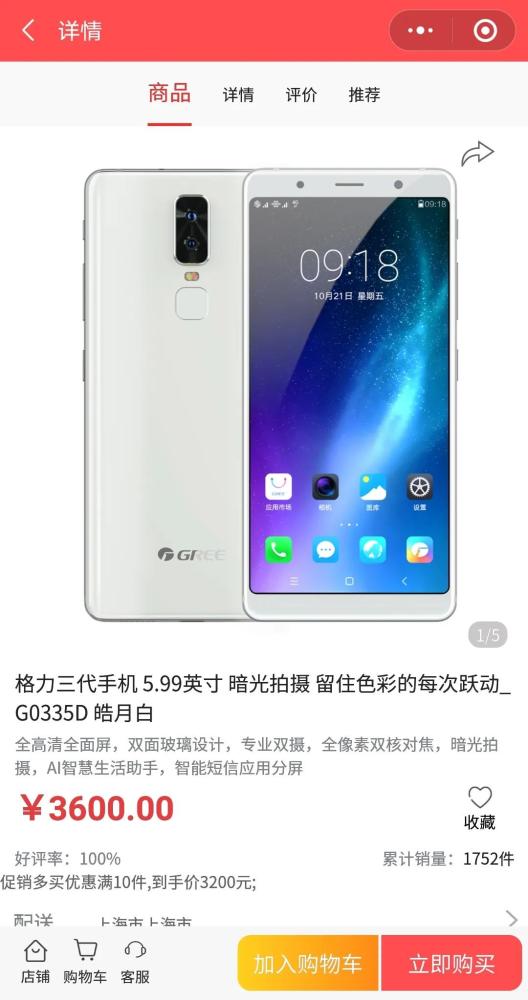 截止12月21日14:00,官网显示大松5G手机共卖出1956台,图源:格力官方商城