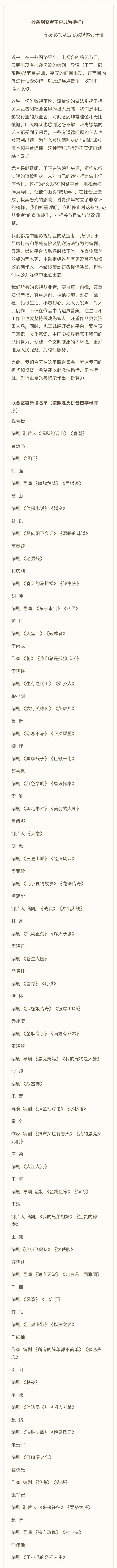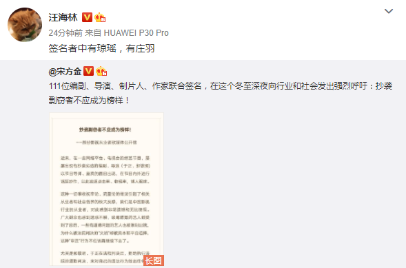 在21日晚,宋方金、汪海林等人就在社交平台上晒出公开信,一共圈内111位编剧、导演、制片人、作家一起抵制抄袭者,点名郭敬明跟于正。斥责近日某些网络平台及电视台的节目,屡次出现有抄袭劣迹的编剧、导演以导师或者嘉宾的身份出现,借他们来炒作话题求点击率博眼球,怒斥抄袭剽窃者不应该成为榜样。