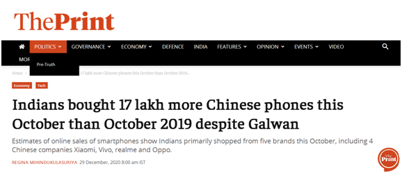 “The Print”新闻网:印度人今年10月比2019年10月多买了170万部中国手机