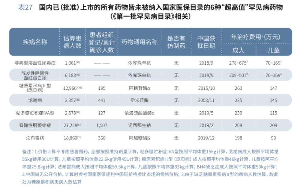 △图1:国内已(批准)上市但未被纳入国家医保目录的6种“超高值”罕见病药物,出自IQVIA《中国城市罕见病医疗保障报告2020》