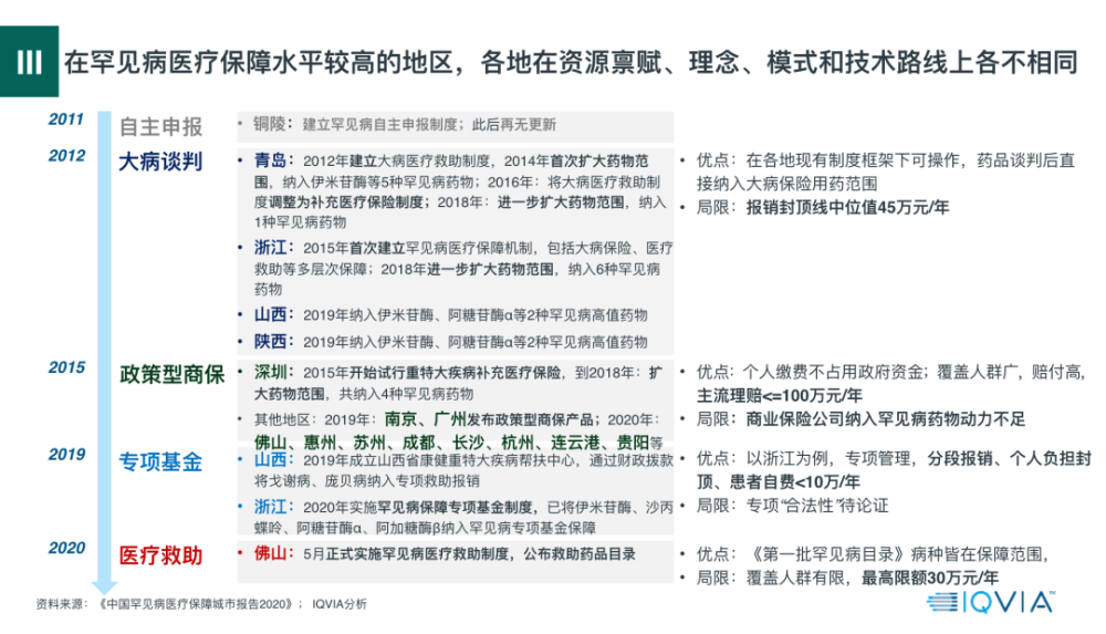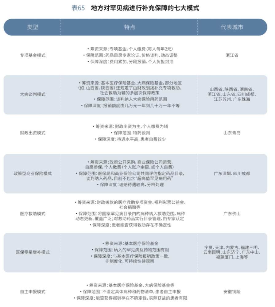 △图2:各地对罕见病保障的7种模式,出自IQVIA《中国城市罕见病保障报告2020》
