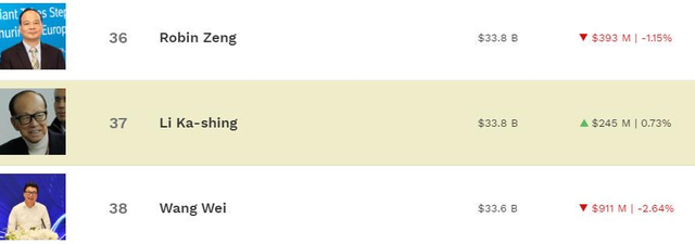 在福布斯实时富豪榜上,李嘉诚身家为338亿美元,不仅距新任亚洲首富钟睒睒相差超500亿美元,还在中国富豪排名中跌出前五位,此前甚至一度被顺丰创始人王卫夺去“香港首富”之位。此外,在最新的福布斯中国富豪榜上,李嘉诚同样以294亿美元身家排名第六位,比上一年跌落两个名次。