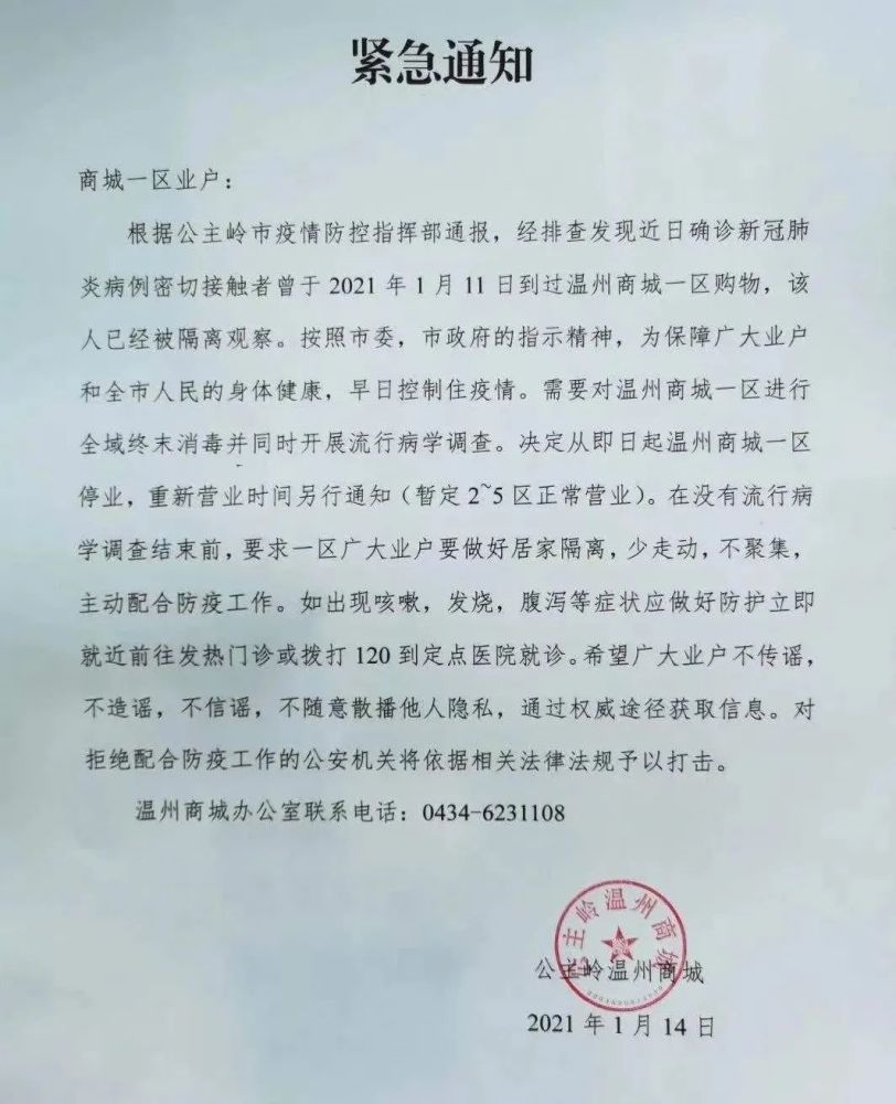 通知称,“根据公主岭市疫情防控指挥部通报,经排查发现近日确诊新冠肺炎病例密切接触者曾于2021年1月11日到过温州商城一区购物,该人已被隔离观察……现对一区进行全域终末消毒并同时开展流行病学调查,即日起一区停业,重新营业时间另行通知。在没有流行病学调查结束前,要求一区广大业户做好居家隔离,少走动,不聚集……”