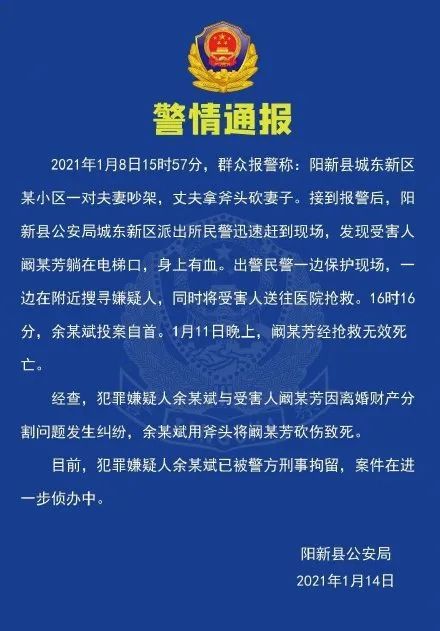 1月8日下午临近4点,丈夫余晓斌在家门口的电梯拦住了阚迎春,一趟电梯29层往返的时间,砍杀了妻子,用一柄铁斧。