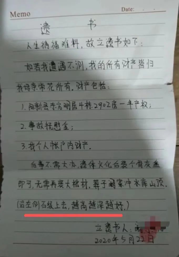 “人生祸福难料,故立遗书如下”,遗书开头这样写道。她把财产留给了母亲,包括一半房产权,事故抚慰金、个人帐户内财产。她交代,后事从简,但她特别说明,希望葬于老家的水库山顶,还详细注明“从左侧石级上去”,强调“越高越深越好”。落款处,留下红色的指纹印记。