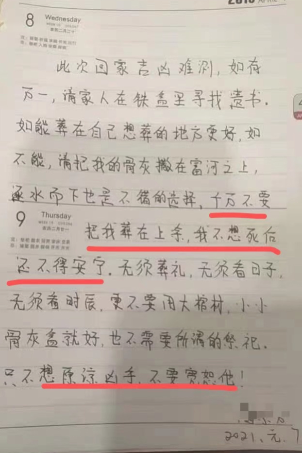 “此次回家吉凶难测,如有万一,请家人在铁盒里寻找遗书。”1月7日,阚迎春写下了这段文字,第二天,她从武汉返回黄石阳新县,不幸的是,她的“万一”预感就在这天应验了。