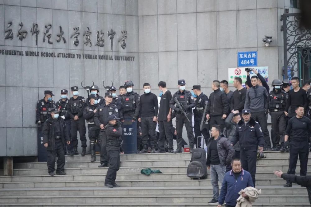 (1月22日,云南师范大学附属实验中学门口发生劫持人质事件,犯罪嫌疑人被击毙,人质获安全解救。本刊记者/刘冉阳 摄)