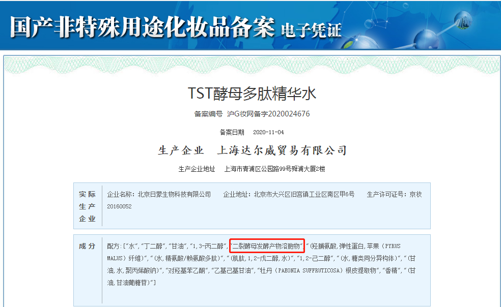在国家药品监督管理局官网上,记者查询TST产品成分发现,所谓的活性酵母,只是“二裂酵母发酵产物溶胞物”。记者查询专业资料发现,这种成分与酵母菌并无关系,更与宣传的“活酵母”相去甚远。通过添加“二裂酵母发酵产物溶胞物”,可以达到保湿、柔肤的效果,但大肆宣传的“逆龄”“美白”等效果是无法实现的。