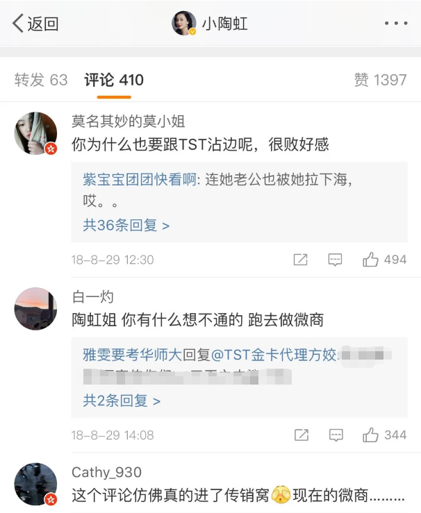 ·但凡陶虹发布与TST相关微博,评论区都会被网友质疑的声音“攻陷”。