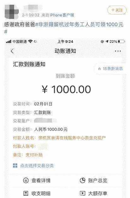 今天(2月1日)零点,春节在杭过年的非浙户籍务工人员1000元现金补贴正式开放申领。
