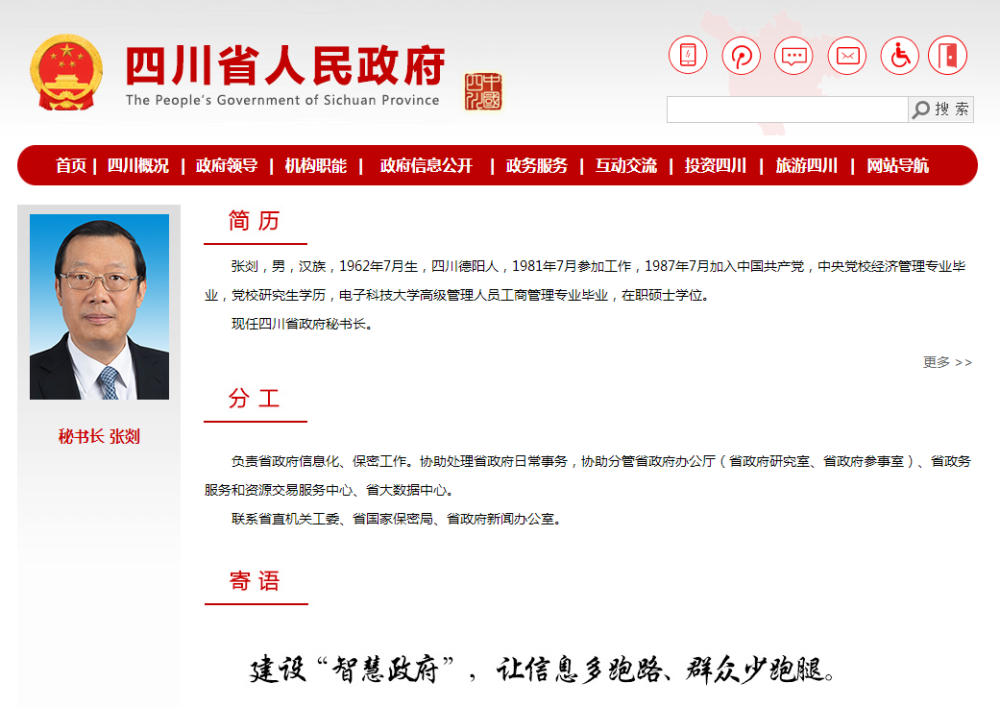 据四川省政府官网介绍,他负责省政府信息化、保密工作,协助处理省政府日常事务,协助分管省政府办公厅(省政府研究室、省政府参事室)、省政务服务和资源交易服务中心、省大数据中心。