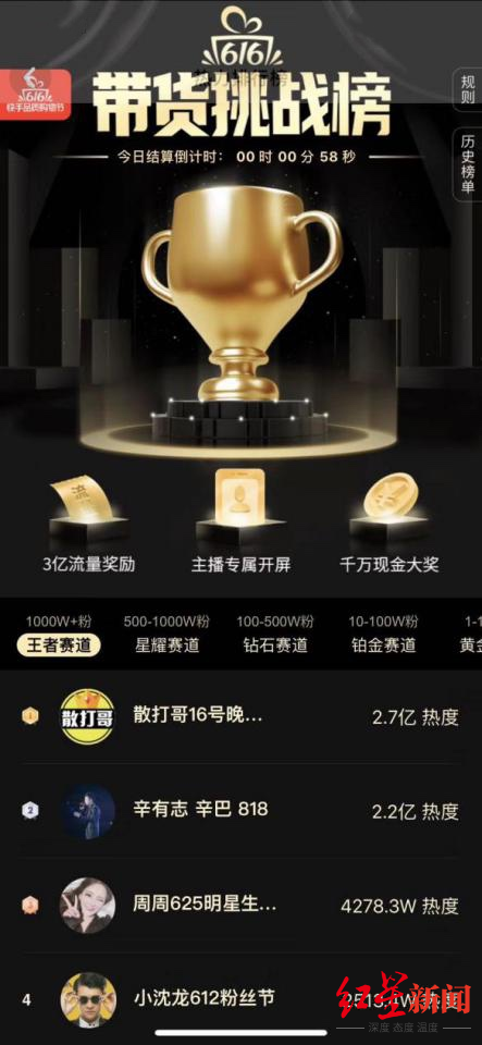 快手616品质购物节,小沈龙热度排名第四