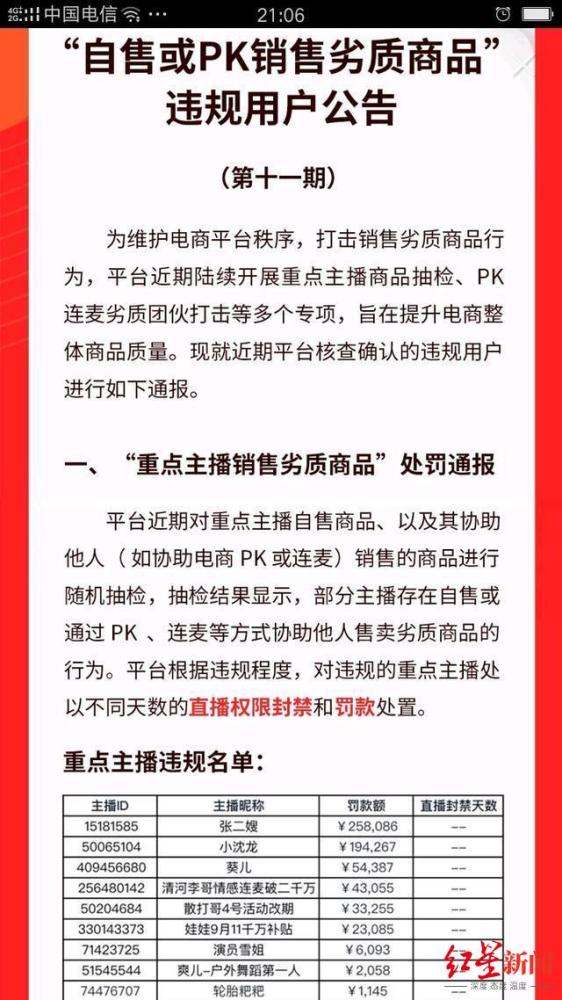 快手第十一期《自售或PK销售劣质商品违规用户公告》截图
