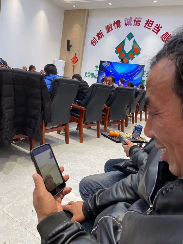 晚饭后,工人们聚到工地的会议室里一起看春节联欢晚会,他们围着长长的会议桌排开,面前摆着水果、瓜子和饮料,有的工人还在和家里打视频电话,电话那头,家里的年夜饭已经吃完了,儿子催着父亲赶紧多发几个红包。