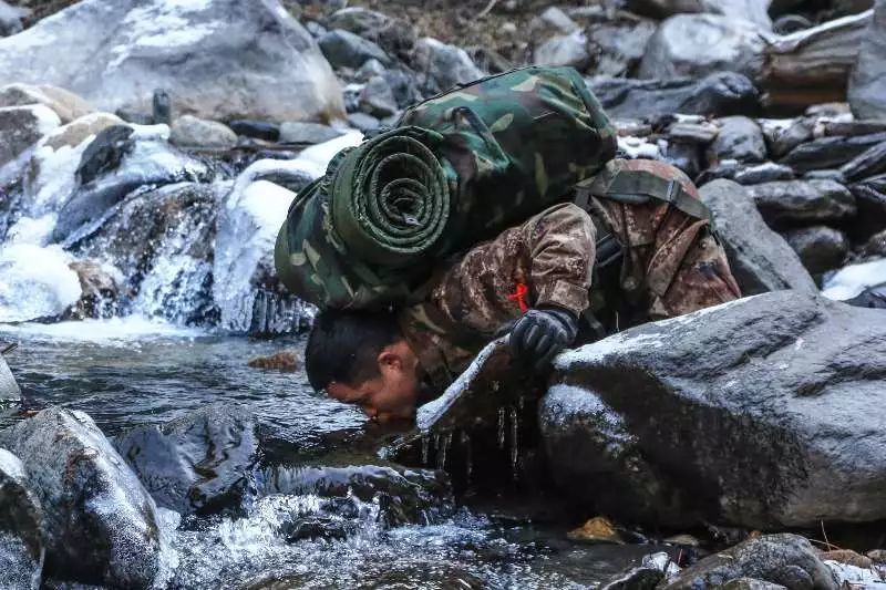 2018年1月10日,西藏一条边防线上,一名巡逻战士俯下身来喝冰水。